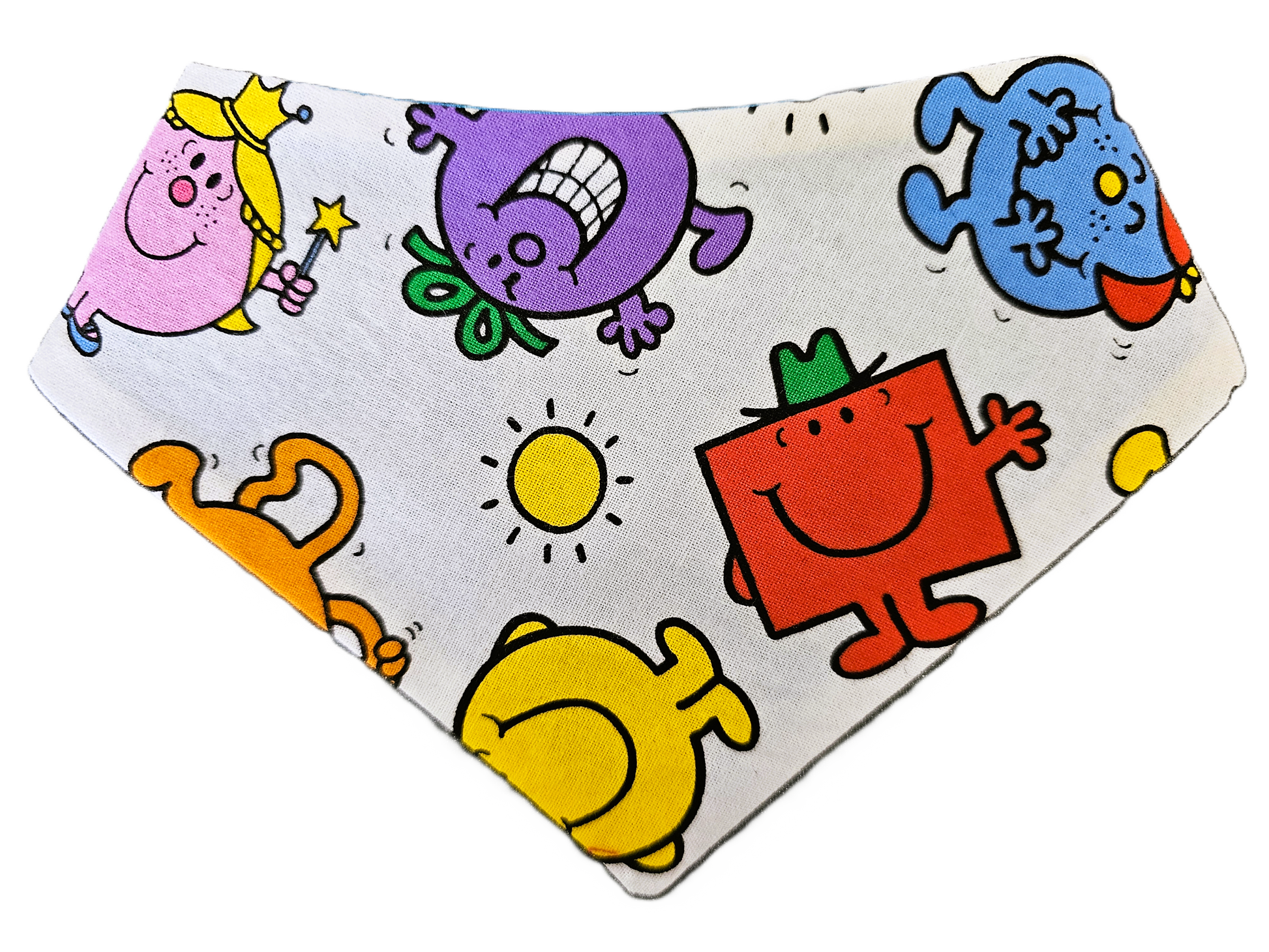 Pamper your furry friend with our Mr Men Dog Bandana! Made in NZ by Taylored Tails, this 100% cotton fabric bandana features beloved characters like Mr Bump. With a velcro fastening, it's easy and comfortable for your pet to wear. Show off your pup's stylish side with this playful bandana!