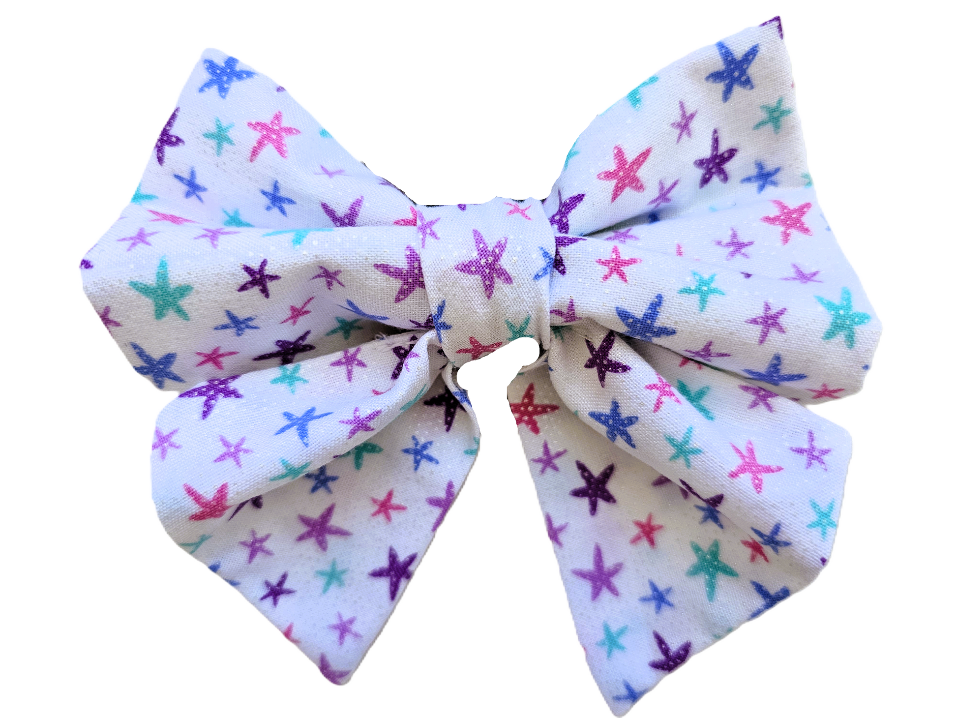 Add a touch of charm to your furry friend's look with our Sparkly Star Fish Bow. Lovingly handcrafted in New Zealand from 100% cotton, this sailor bow is not only stylish but also comfortable for your pet. Easy velcro fastening makes it fuss-free for both pet and owner.