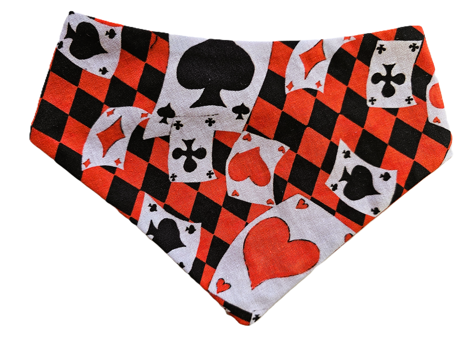 Take your pup on a colorful adventure with our We're All Mad Here Playing Cards Dog Bandana. Printed with bold and daring playing cards, this bandana will have your furry friend feeling like a risk-taking champion. Perfect for any outdoor excursion, this bandana is sure to inspire and motivate. Get yours now!